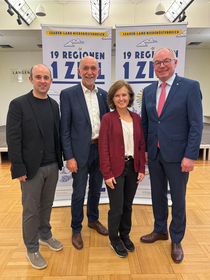Bei der LEADER-Fachveranstaltung in Langenlois: v.l.n.r: Moderator und PAG-Mitglied Christian Haider, Obmann Bgm. Josef Schaden, LAG-Managerin Michaela Böhm-Loidolt neben LH-Stv. Dr. Stephan Pernkopf; (c) WV Grenzland